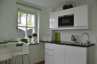Die Kücheneinrichtung ist Bestandteil einer Wohnküche. Hier werden Ihnen alle Annehmlichkeiten einer komfortablen Selbstversorgung geboten: Kühlschrank mit Gefrierfach, 2-fach Ceranfeld, Geschirrspüler, Mikrowelle, Kaffeemaschine, Toaster, Wasser- und Eierkocher. Geschirr, Gläser, Bestecke und „Küchenwerkzeuge“ sind reichlich vorhanden.