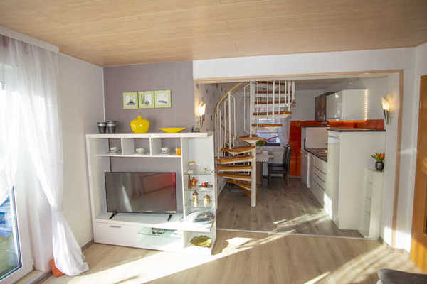 Im Erdgeschoss befindet sich neben dem Eingangsbereich das Wohnzimmer, ein kleineres Schlafzimmer (für 2 Personen), die offene Küche und ein Gäste-WC. Das Obergeschoss, welches über eine Wendeltreppe erreichbar ist, umfasst Bad mit Dusche, ein großes Schlafzimmer (2 Personen plus Aufbettung für 2 Personen) und eine Leseecke. Alle Räume sind hell, freundlich und modern eingerichtet. Die Küche ist ausgestattet mit mit 2-Platten-Ceranfeld und Minibackofen, Kühlschrank, Geschirrspüler, einem Frühstückscenter und allem notwendigen Geschirr.