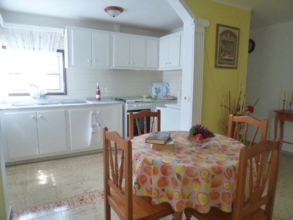Man betritt das Haus durch die Wohnküche,in der 4 Personen Platz finden. Die gut ausgestattete Küche bietet neben viel Stauraum einen Gasherd mit 4 Platten sowie einen Backofen, einen Kühlschrank und gängige Elektrogeräte. Vom Essbereich aus gelangt man direkt in den Garten.