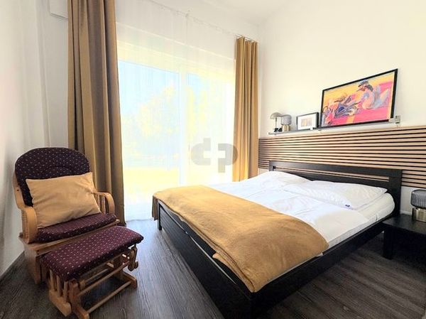 Das helle und freundliche Schlafzimmer ist mit einem Doppelbett und 2 hochwertigen, separaten Matratzen eingerichtet. Das geflieste Bad ist mit hochwertiger Ausstattung versehen, dazu gehören die ebenerdige Dusche mit Glastür, Waschtisch und WC.