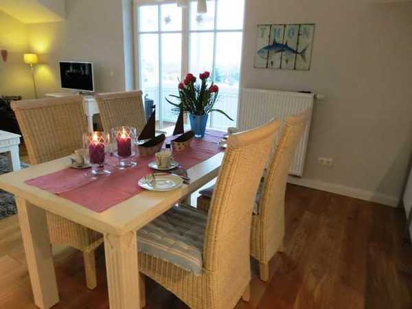 Unsere Ferienwohnung "Sturmmöwe" befindet sich im 2. Obergeschoss mit großem Balkon. Sie ist für 4 Personen + Kleinkind exklusiv eingerichtet und verfügt neben dem großzügigen Wohn/ Essbereich mit komplett ausgestatteter Küche, über zwei Schlafzimmer, ein Tageslichtbad sowie einen Flur. Hohe helle Räume und hochwertige Landhausdielen tragen zum Wohlbefinden bei. Für unsere kleinen Gäste stellen wir Ihnen ein Kinderreisebett und einen Hochstuhl kostenfrei zur Verfügung.