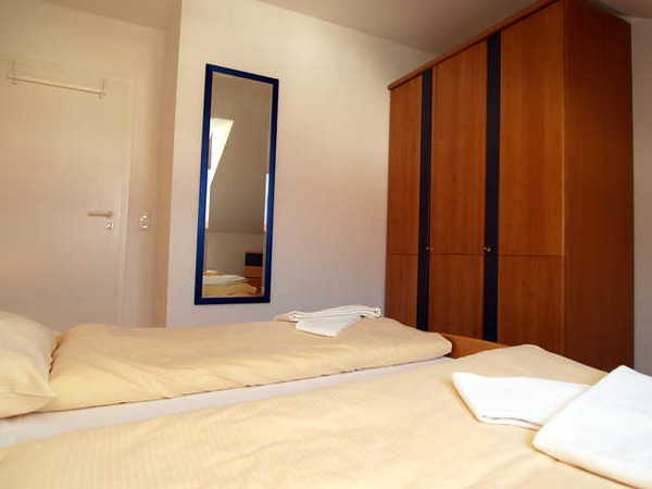 Im Schlafzimmer lädt Sie ein komfortables Doppelbett (2 x 90cm x 200 cm) zur Nachtruhe ein. Der geräumige Kleiderschrank bietet genügend Platz für Ihre Urlaubsgarderobe. Als Sichtschutz bzw. zum Verdunkeln ist im Schlafzimmer ein Plissee und ein Vorhang an den Fenstern angebracht. Das geflieste Bad mit Dusche und WC vervollständigen das Gesamtbild dieser Wohnung.