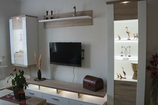 Sie finden einen Wohnraum mit Schlafcouch und Flachbildfernseher, einen Schlafraum mit einem Doppelbett, sowie eine komplett ausgestattete Küche mit Spülmaschine vor. Das Tageslichtbad ist mit einer Badewanne ausgestattet.