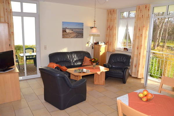 Diese stilvoll eingerichtete Wohnung mit 50² liegt im Erdgeschoss. Es gibt einen Wohnraum mit kompletter, gut ausgestatteter Küchenzeile, ein separates Schlafzimmer mit 1,80 m breitem Doppelbett, ein weiteres Schlafzimmer mit 2 Einzelbetten, ein Bad mit ebenerdiger Dusche sowie eine möblierte Terrasse. Glatte Fußböden, Ledercouch und abwischbare Bezüge kommen Allergikern entgegen. Die Nichtraucherwohnung wirkt durch ihre bodentiefen Fenster hell und freundlich.