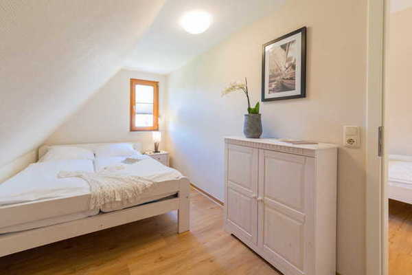 Im Obergeschoss gibt es ein Schlafzimmer mit Doppelbett und ein Schlafzimmer mit zwei Einzelbetten. Das Badezimmer hat Dusche/WC. Die Terrasse ist Richtung Zufahrtsstraße zur Halbinsel Fischland/Darß.