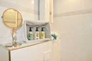 Das Badezimmer ist modern gestaltet und verfügt über einen Haartrockner, Badevorleger und Handtuchpaket. Helles Holz und sanfte Beleuchtung sorgen für eine warme Atmosphäre, während große Fenster den Raum mit natürlichem Licht fluten. Ein kleiner, aber feiner Esstisch bietet Platz für gemeinsame Mahlzeiten und die gepflegte Einrichtung sorgt für ein rundum angenehmes Wohngefühl.