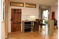 Der Wohnraum ist mit antiquaren und modernen Möbeln eingerichtet. Ein besonderes Schmuckstück ist die urige 300 Jahre alte Tür zum Bad mit historischen Beschlägen. Im Wohnraum befindet sich eine Küche mit Bartresen und zwei Barhockern. Ausgestattet ist diese mit 3 Herdplatten, Minibackofen, einem Kühlschrank mit Gefrierfach, Spülbecken, Koch- und Essgeschirr, Wasserkocher, Toaster, Kaffeemaschine, French- Press Kaffeekanne und Espressokocher.