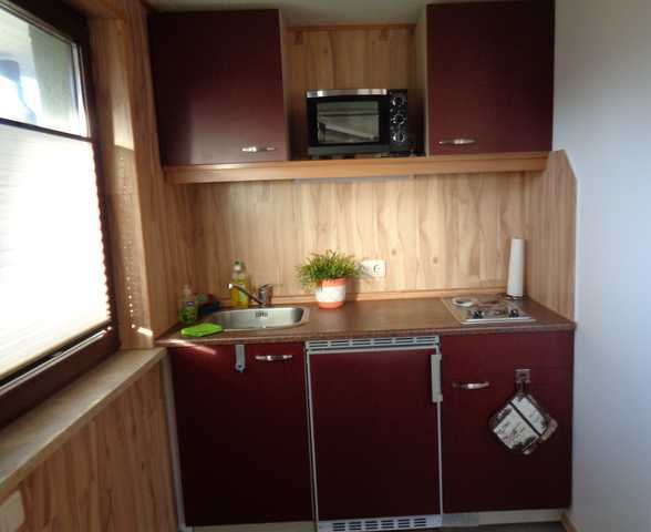 Kleine Ferienunterkunft mit sep. Eingang auf eigenem Grundstück, Sitzen im Grünen (Gartenmöbel vorhanden) in ruhiger, aber doch zentraler Lage, Terrasse, ebenerdig. Kombination aus Wohn- und Schlafraum mit zwei Einzelbetten 80x200, moderner Bartisch mit 2 Barhockern