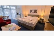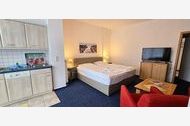 1 Raumapartment mit gut ausgestatteter Küchenzeile mit Cerankochfeld , Doppelbett , Kabelfernsehen und Stereoanlage , möbilierter Balkon in Westlage , Couch mit Tisch , Dusche , WC,