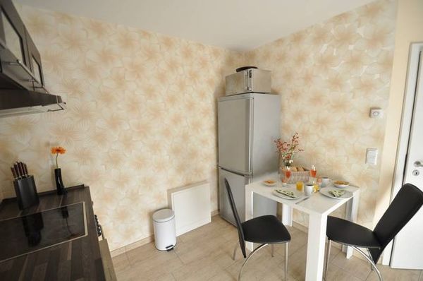 Die modern und offene Küche ist mit einem Herd, Abzugshaube, Backofen, Geschirrspüler, Wasserkocher, Kaffeemaschine, Toaster, Mikrowelle, Kühlschrank mit Frosteinheit und Esstisch mit Stühlen komplett ausgestattet. Im Schlafzimmer wartet auf Sie ein bequemes Doppelbett (140cm breit) sowie ein geräumiger Kleiderschrank.