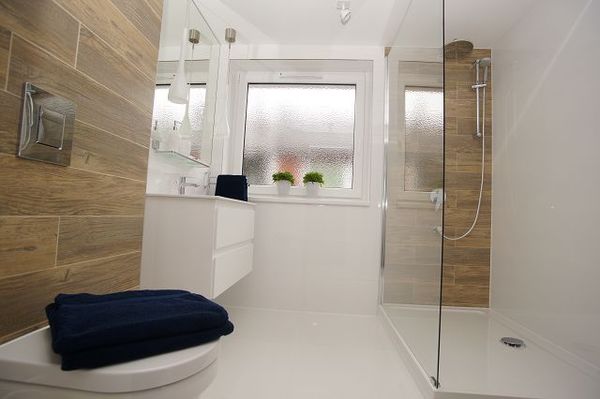 hochwertiges Bad mit ebenerdigem Duschwannenzugang u. WC.