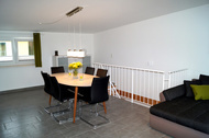 Die offene Küche mit großem Esstisch und sechs Stühlen ist in das Wohnzimmer integriert und verfügt unter anderem über einen Backofen, 4 Ceranfelder, einen Geschirrspüler, einen Kühlschrank, eine Mikrowelle, eine Kaffeemaschine und einen Wasserkocher.