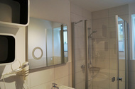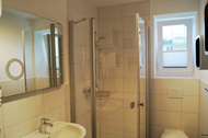 Im gefliesten Bad mit Fenster befinden sich die Dusche, das WC und eine Waschmaschine. Ein Bügelbrett und ein Bügeleisen befinden sich im Abstellraum.