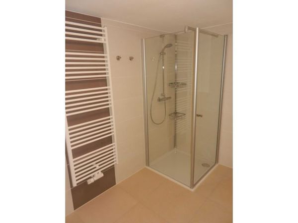 Das große Badezimmer verfügt über eine Dusche und WC.