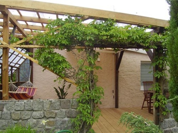 überdachte Terrasse mit Sitzecke und Hängematte, Wäscheständer