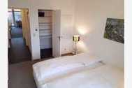 Ein Doppelschlafzimmer zur Hofseite bietet ein Boxspringbett (180x200) mit offenem Fußende, Nachtisch, Leselampen und einem geräumigen begehbarer Kleiderschrank alles, was ein entspannter Sylt-Urlaub benötigt.