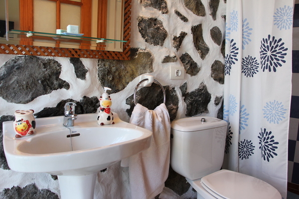 Die separate Küche ist gut ausgestattet, eine Wand wurde in Naturstein belassen. Dekorative Elemente wie z.B. eine alte Nähmaschine oder ein altes Spinnrad werden gekonnt in Szene gesetzt und verstärken den orginalen Charakter des Hauses. Zwei alte Kutschräder wurden zu einer Bank umfunktioniert. An der Wand zeigen alte Bilder Fuencaliente aus früheren Zeiten und kurz nach dem Vulkanausbruch. Von der Küche hat man Zugang direkten Zugang in den Garten.