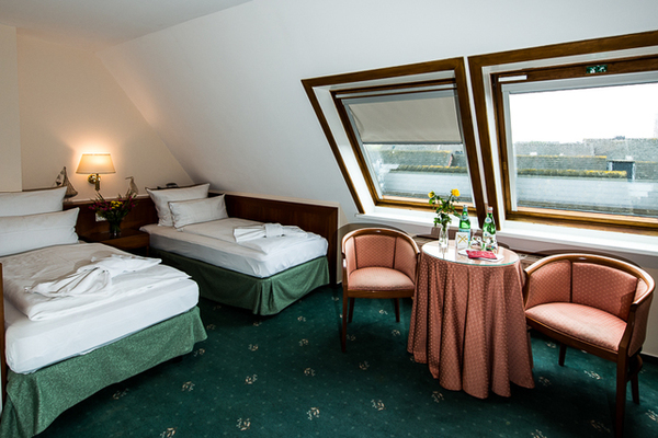 Klassisch eingerichtetes, geräumiges Zweibettzimmer mit Dusche/WC, zur Landseite im 3.Stock Dachgeschoss. (KEIN Fahrstuhl) Das Zimmer verfügt über 2 getrennt stehende Betten. Das Frühstück ist inklusive.