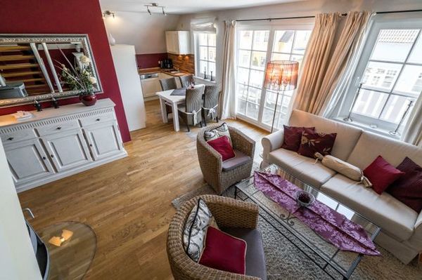 Einen Katzensprung entfernt zur Ostsee können Sie den Abend bei schönem Sonnenuntergang und einem Glas Wein auf dem Balkon (zur Straßenseite) ausklingen lassen. Das gesamte Ambiente der Wohnung ist hell und freundlich und wurde hochwertig und geschmackvoll eingerichtet. Die Küchenzeile ist mit einem Geschirrspüler, Mikrowelle sowie einem Herd mit Backofen ausgestattet. Die Wohnung verfügt eine TV-Sat-Anlage. Außerdem können Sie wohlige Gemütlichkeit am Kaminofen im Wohnbereich genießen. 2 - 4 Personen finden in dieser Wohnung statt. Es gibt zwei Schlafzimmer mit Doppelbett und zwei Bäder. Im Obergeschoss befindet sich ein Schlafzimmer mit Doppelbett sowie einem Badezimmer mit Dusche / WC. Im Dachgeschoss befindet sich das zweite Schlafzimmer mit Doppelbett sowie einem Badezimmer mit Badewanne / WC.