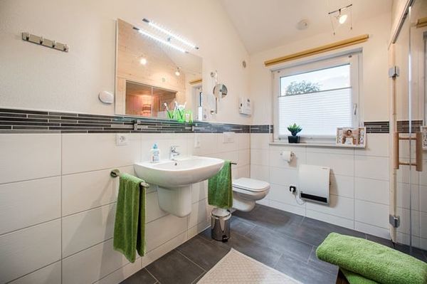 Im Badezimmer haben wir an der rechten Seite einen kleinen Wellnessbereich für Sie geschaffen. Eine Sauna (bis 80°) für zwei Personen steht Ihnen zur Verfügung. Direkt neben der Sauna befindet sich eine ca. 1,20 m breite ebenerdige Dusche mit einer Echtglas-Duschabtrennung. Waschbecken und Toilette befinden sich auf der linken Seite.