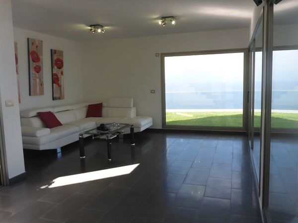Die zurückhaltende Möblierung mit einer großen weißen Ledereckcouch unterstreicht die Wirkung des fantastischen Ausblicks auf den Atlantik. Auch hier gibt es selbstverständlich Sat TV und WLAN.