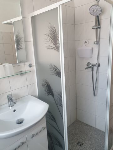 Das Badezimmer verfügt über eine Dusche / WC und Fön.