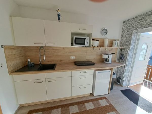Die separate Küche mit kleinem Essbereich bietet folgende Ausstattung: 2 Platten-Induktionsherd, Kühlschrank, Mikrowelle und diverse Küchenutensilien.