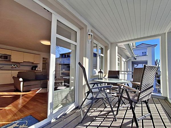 Der helle Wohnbereich ist komfortabel eingerichtet und verfügt über zwei gemütliche Sofas sowie einen Esstisch mit vier Stühlen, der ausreichend Platz für gemeinsame Mahlzeiten bietet. Ein besonderes Highlight ist der großzügige Westbalkon, auf dem Sie bei schönem Wetter bereits am Morgen Ihren Kaffee genießen oder den Abend entspannt bei einem Glas Wein ausklingen lassen können.