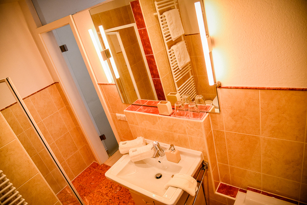 Luxuriöses Bad en Suite mit Badewanne, WC und toller Massagedusche.
