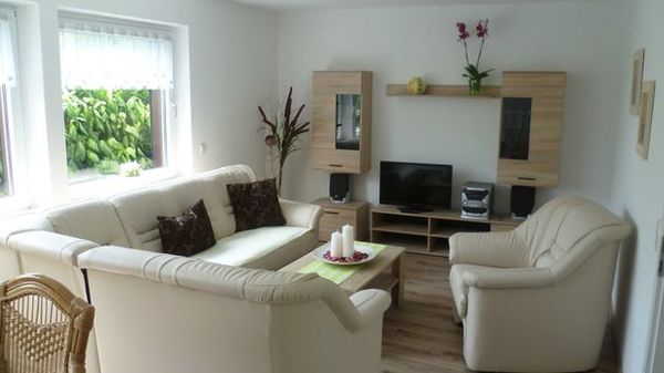 - 1 Wohnzimmer mit ausziehbarer Schlafcouch, Essecke, Fernseher, Radio und Musikanlage