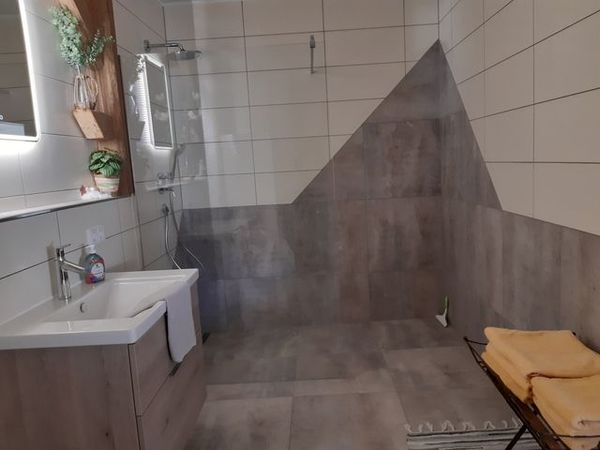 Das Bad ist mit einer geräumigen Dusche, Waschmaschine und Trockner ausgestattet.
