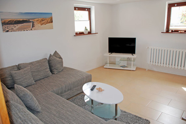 Diese modern eingerichtete Ferienwohnung liegt im Soutterain eines Doppelhauses und bietet auf 65 qm großzügig Platz für max. 3 Erwachsene sowie 2 Kinder bis 17 Jahre und hat Internet - WLAN. Über den separaten Eingang gelangen Sie in den großzügigen Flur mit Garderobe, Spiegel und Kleiderschrank. Im großen, hellen Wohnzimmer stehen eine bequeme Polstersitzgruppe mit Tisch und Sesseln und ein Schrank mit Flachbild - TV - Gerät. Hier steht auch ein Esstisch mit Stühlen. Im großen Schlafzimmer stehen ein bequemes Doppelbett mit Nachttischen und Leselampen, ein Einzelbett sowie ein Kleiderschrank. Bei Bedarf kann im Wohnbereich die Couch für zwei Kinder bis 17 Jahre mit aufgebettet werden. Die separate, moderne Küche ist mit einem 2-Plattenherd, Geschirrspüler, Abzugshaube, Wasserkocher, Kaffeemaschine, Toaster und Kühlschrank komplett ausgestattet.