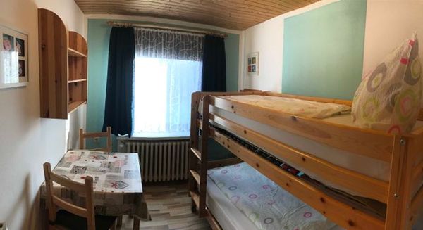 ein Kinderzimmer mit Etagenbett und Dusche/WC.