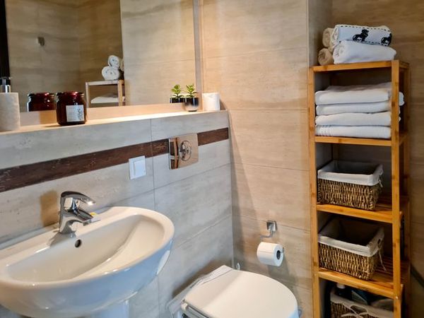 Im Bad befindet sich ein WC und eine Duschkabine und einer automatischen Waschmaschine. Die Fenster der Ferienwohnung sind auf den Innenhof gerichtet.
