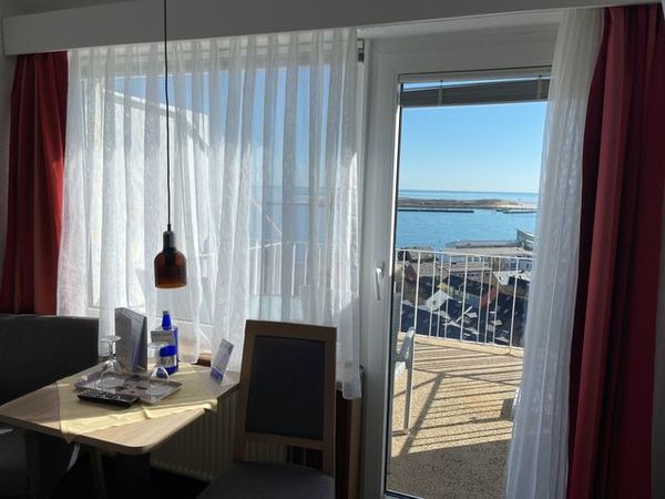 Gemütlich eingerichtetes Doppelzimmer mit Seesicht über die Düne, Reede und weite Nordsee, mit Balkon-Terrasse, Sitzecke vor dem Fenster, Flachbild-TV, Badezimmer mit Dusche /WC. Das Frühstück ist im Zimmerpreis enthalten.