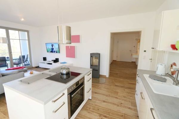 Die Ferienwohnung (Nichtraucher) hat eine Wohnfläche von ca. 92 m² zuzüglich 28 m² überdachtem Balkon. Die Wohnung ist optimal für max. 4 Erwachsene und 2 Kleinkinder bis zu 3 Jahren im Kinderreisebett ausgestattet. 1x Hochstuhl und 1x Kinderreisebett mit zusätzlicher Matratze ohne Bettinlett stehen Ihnen inklusive zur Verfügung. Die verwendeten Materialien der Wohnung sind exklusiv. Ökologische Gesichtspunkte wurden berücksichtigt, so versorgt Sie die Solartherme mit warmem Wasser und die dreifach verglasten Fenster vermindern den Verbrauch an Wärmeenergie. Die Schallschutz-Eingangstür und der private Vorflur schirmen Sie von den anderen Wohnungen ab. Die Möblierung der Wohnung haben wir der Lage und Architektur angepasst: hell, luftig, offen, modern: genießen Sie die Weite und Leichtigkeit auch im Inneren der Wohnung. Der Wohn-/Essbereich ist überwiegend in dänischem Design gestaltet. Technisch ist das Wohnzimmer mit einem Smart-TV, einem Blu-Ray-Player, einer Stereoanlage mit Anschlussmöglichkeit für Android oder I-Phone via Bluetooth sowie DAB-Radio und einem Internetanschluss (WLAN) ausgestattet. In der kalten Jahreszeit sorgt ein Kamin (mit Seitenscheiben für Rundumblick auf die Flammen) für eine angenehme Atmosphäre. Ein Schreibtisch, ein Lesesessel, eine Leselampe und eine komfortable Couchecke runden den Wohnbereich ab. Die helle Küche mit Kochinsel, offen zum Wohnbereich, ist vollwertig ausgestattet mit Geschirrspüler, Kühlschrank, Gefrierschrank, Backofen, 4-Zonen-Cerankochfeld, Mikrowelle, Kaffeemaschine, Toaster, Wasserkocher, Nespresso-Maschine, Mixer und French Press. Ein großer Esstisch lädt zum gemeinsamen Essen ein. Für den erholsamen Schlaf erwarten Sie im en-suite Schlafzimmer ein bequemes Komfort-Doppelbett (1,80 m x 2,00 m) mit hochwertigen Matratzen und verstellbaren Lattenrosten, ein Kleiderschrank, Nachttische und Wecker. Das 2.Schlafzimmer ist identisch ausgestattet, mit dem Unterschied, dass zwei Einzelbetten (je 0,90 m x 2,00 m) Ihrem geruhsamen Schlaf dienen. Die Betten sind leicht beweglich und können zusammen oder getrennt gestellt werden. Beide Schlafzimmer können bei Bedarf vollständig verdunkelt werden und verfügen zusätzlich über je einen Smart-TV. Auf die Balkone gelangen Sie vom Wohn-/Essbereich sowie beiden Schlafzimmern. Die Balkone (Nord/West & Süd/West) sind mit hochwertigem Esstisch und Stühlen sowie Liegestühlen ausgestattet, ergänzt durch eine Lounge-Ecke. Das große Wellness-Bad mit Sauna, freistehender Badewanne, bodengleicher Dusche, WC, Waschtisch, Kosmetikspiegel, elektrisch beheizbarem Handtuchhalter, Smart-TV und Fön lässt keine Wünsche offen. Das kleine Bad verfügt über eine bodengleiche Dusche, WC und Waschtisch. In den beiden Abstellräumen finden Sie eine Waschmaschine, einen Trockner, sowie Bügeleisen und -brett. Die Fußbodenheizung ist pro Raum individuell regelbar. Im abschließbaren Nebengebäude können Sie Ihre Fahrräder sicher unterstellen. Der PKW kann auf den kostenfreien Stellplatz Nr. 05 direkt vor dem Haus geparkt werden. Haustiere sind nicht erlaubt. Die Erstausstattung eines Wäschepaketes (komplette Bettwäsche, 1 Duschhandtuch, 2 kleine Handtücher) können Sie bis 14 Tage vor Anreise gegen einen Aufpreis dazu buchen oder durch eigene ergänzen. Ab 2 gebuchten Paketen erhalten Sie einmalig 1 Geschirrhandtuch und 1 Duschvorleger hinzu.