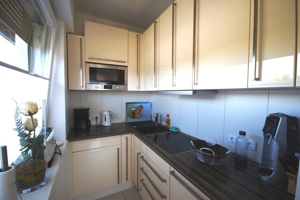 Küche: voll ausgestattete Einbauküche mit Esstisch mit Stühlen, Mikrowelle mit Grillfunktion, Spülmaschine, Kühlschrank mit Gefrierfach, Cerankochfeld, Kaffeemaschine, Wasserkocher, Toaster und zahlreiche weitere Küchenutensilien.