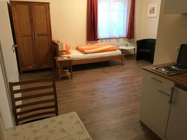 Wir bieten Ihnen fünf individuell eingerichtete Appartements mit kombiniertem Wohn-Schlafraum und Duschbad.