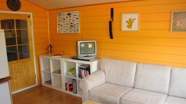 Kleine Hütte (30 Kvm) ,2 Zimmer -ein Wohnraum mit Küchenecke von 16 Kvm ,ein Schlafzimmer von 12 Kvm und ein kleines Bad mit Dusche, Waschbecken und WC.
