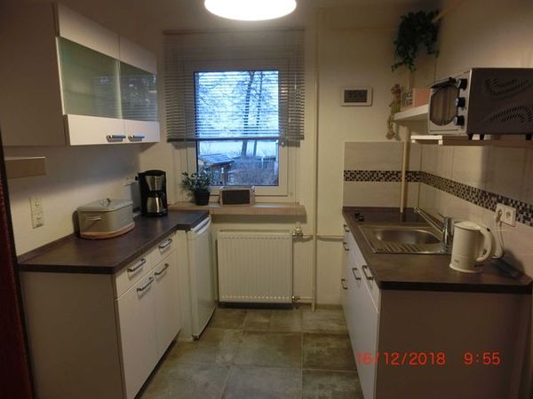 Die Küche hat eine konfortable Ausstattung mit einem neuen Kühlschrank mit Gefrierfach, Geschirspülmaschine, elektr. Backautomaten, Ceranfeldkochplatte, Kaffeemaschine und Wasserkocher.