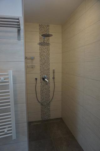 Das moderne Badezimmer mit zwei Waschbecken, ebenerdiger Dusche/WC, Handtuchwärmer und Elektroheizung rundet den Wohnbereich im Erdgeschoss ab. Das gesamte Erdgeschoss ist komplett gefließt und der obere Bereich mit Holzfußboden ausgelegt.