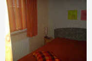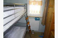 Ein Doppelbett steht in dem einem Schlafzimmer, ein Etagenbett in dem anderem Schlafzimmer.