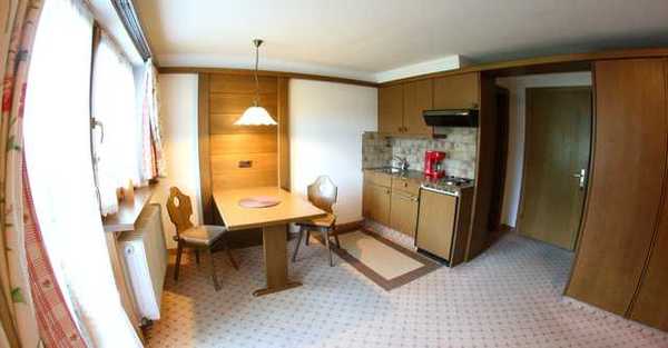 Das kleine, gemütlich eingerichtete Appartement ist geeignet für 1-2, max. 3 Personen und misst ca. 36m². Es befindet sich im 2. Stock und verfügt über einen optisch abgetrennten Schlafbereich, hellen Wohn-Eßbereich mit Miniküche, großen Schrank, Dusche/WC, Ausziehcouch und "Balkon zur Bergwelt" - ostseitig.