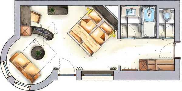 einfacheres Bad mit Badewanne, WC getrennt, Föhn, Schminkspiegel, Bademantel, Sat-TV, Telefon, Radio, Safe, Sitzecke mit Couch,großer Erker mit Tisch, Balkon, Nichtraucher, Einzelnutzung möglich (Haustiere möglich)