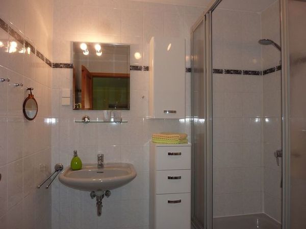 Im Bad finden Sie Dusche, WC, Handwaschbecken und Fön.