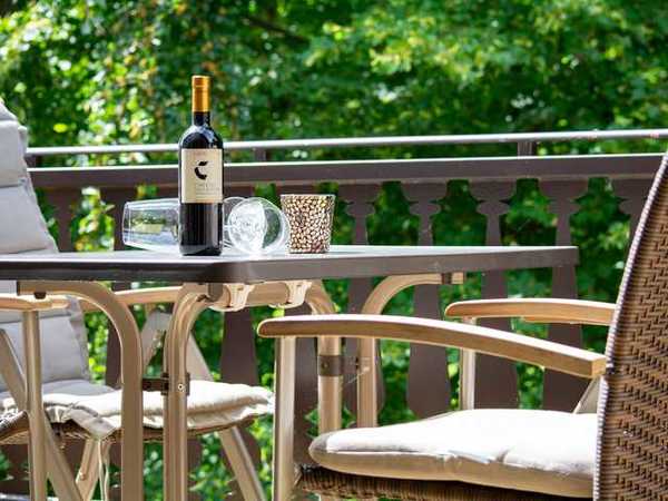 Diese mit sehr viel Liebe zum Detail eingerichtete 3-Raum-Ferienwohnung lässt keine Wünsche offen. Bereits beim Betreten der 72qm großen Wohnung, die sich im 2. Obergeschoss befindet, stellt sich der Urlaubsmodus ein: Das stimmige Farb- und Beleuchtungskonzept im mediterranen modernen Stil beginnt bereits an der Garderobe und zieht sich durch alle Räume. Ein große kuschelige Couch im Wohnzimmer, zahlreiche Bücher zum Stöbern in den handgefertigten rustikalen Regalen, ein gefülltes Weinregal, moderne Weingläser in der Vitrine ... einfach nur Ankommen und Wohlfühlen! Vom Wohnraum betreten Sie den möblierten Balkon, der nach Westen ausgerichtet ist und einen Blick auf den Kühlungsborner Stadtwald freigibt. Obwohl sich das Ensemble in Top zentraler Lage befindet, können Sie hier Ihre Ruhe genießen weitab vom Trubel der Stadt.