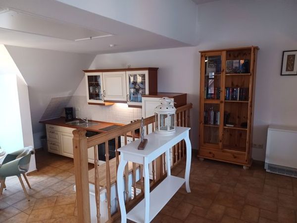 Das Wohnzimmer wurde ausgestattet mit einem Kamin, (das Kaminholz ist von den Gästen mitzubringen). einer Couch und SAT- TV . Alle Wohnungen sind Nichtraucherwohnungen. In der offenen Küchenzeile befinden sich ein Backofen und Geschirrspüler, sowie umfangreiche Küchenutensilien. Für unsere kleinen Gäste können Sie Kinderreisebett und Kinderhochstuhl à 10,00 /pro Woche dazubuchen. Für die nächtliche Ruhe steht Ihnen 1 Schlafzimmern mit 1 Doppelbett 1,80 x 2,00 m (getrennte Matratze) zur Verfügung. Im Schlafgiebel befindet sich eine weitere Schlafgelegenheit mit einem Doppelbett. Der Schlafgiebel mit einer Stehhöhe von ca. 1,65 m ist über eine ausziehbare Treppe zu erreichen und ist nur für Kinder ab 6 Jahre geeignet. Die Bettwäsche und Handtücher können bei der Zimmervermittlung dazugebucht werden - ein Paket 19,50 (1 Badetuch, 1 Handtuch, 1 Kopfkissen, 1 Bezug und 1 Spannbettlaken). Ein WLAN Gästezugang steht Ihnen während Ihres Aufenthaltes kostenlos zur Verfügung. Zum gemütlichen Verweilen lädt die Terrasse mit Strandkorb ein. Ein Parkplatz befindet sich auf dem Grundstück. Haustiere sind herzlich willkommen. Die Ferienwohnung wurde mit einer Elektroheizung ausgestattet.
