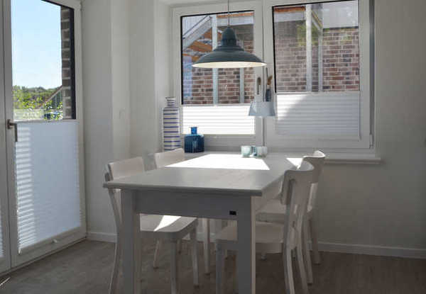 Der Bezug zur See ist in der Ferienwohnung Skagen im Erdgeschoss deutlich zu erkennen. Die Einrichtung ist im maritimen Stil in den Farben Weiß und Blau gehalten und wird durch ausgewählte Accessoires von GreenGate ergänzt.