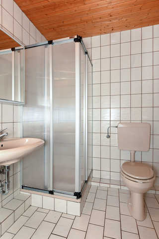 Badezimmer mit Dusche, Waschtisch und WC