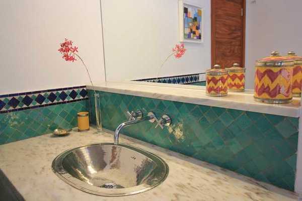 Das Bad mutet durch smaragdfarbene, handgefertigte marrokanische Fliesen sowie ein gehämmertes Waschbecken aus versilbertem Kupfer orientalisch an.